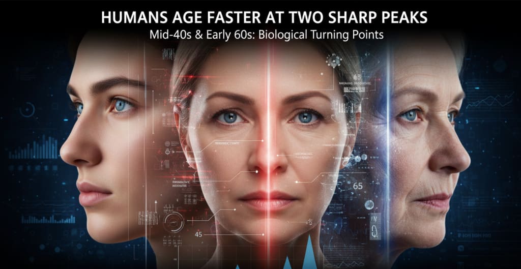 These “sharp peaks” in aging occur around the mid-40s and again in the early 60s. Rather than declining gradually year by year, our bodies appear to undergo sudden biological shifts during these periods — reshaping how we understand longevity, disease prevention, and healthy living.