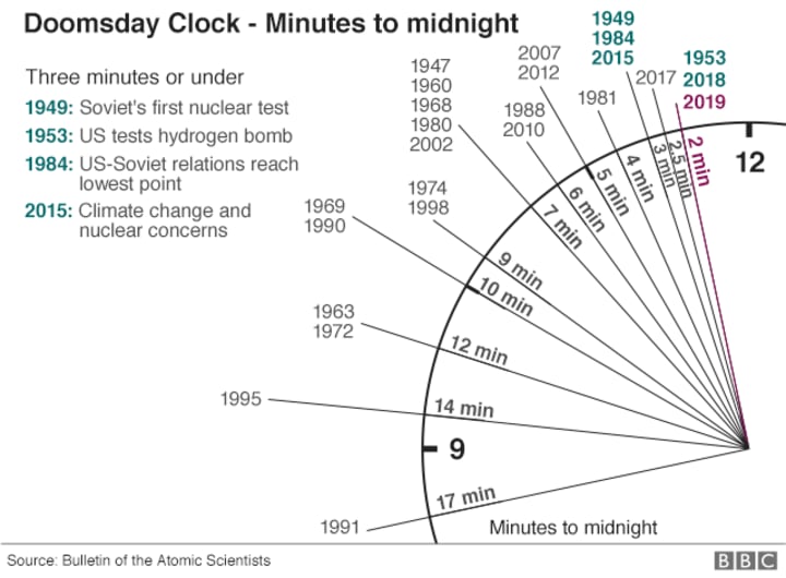 Since 1947 the Doomsday Clock has served as a symbolic representation of the likelihood of a man-made global catastrophe. For the last two years it remained at two minutes to midnight, the highest since 1953-59 and the height of the Cold War. Is humanity really once again on the brink of armageddon or is there a more rational explanation for this shocking doomsaying?