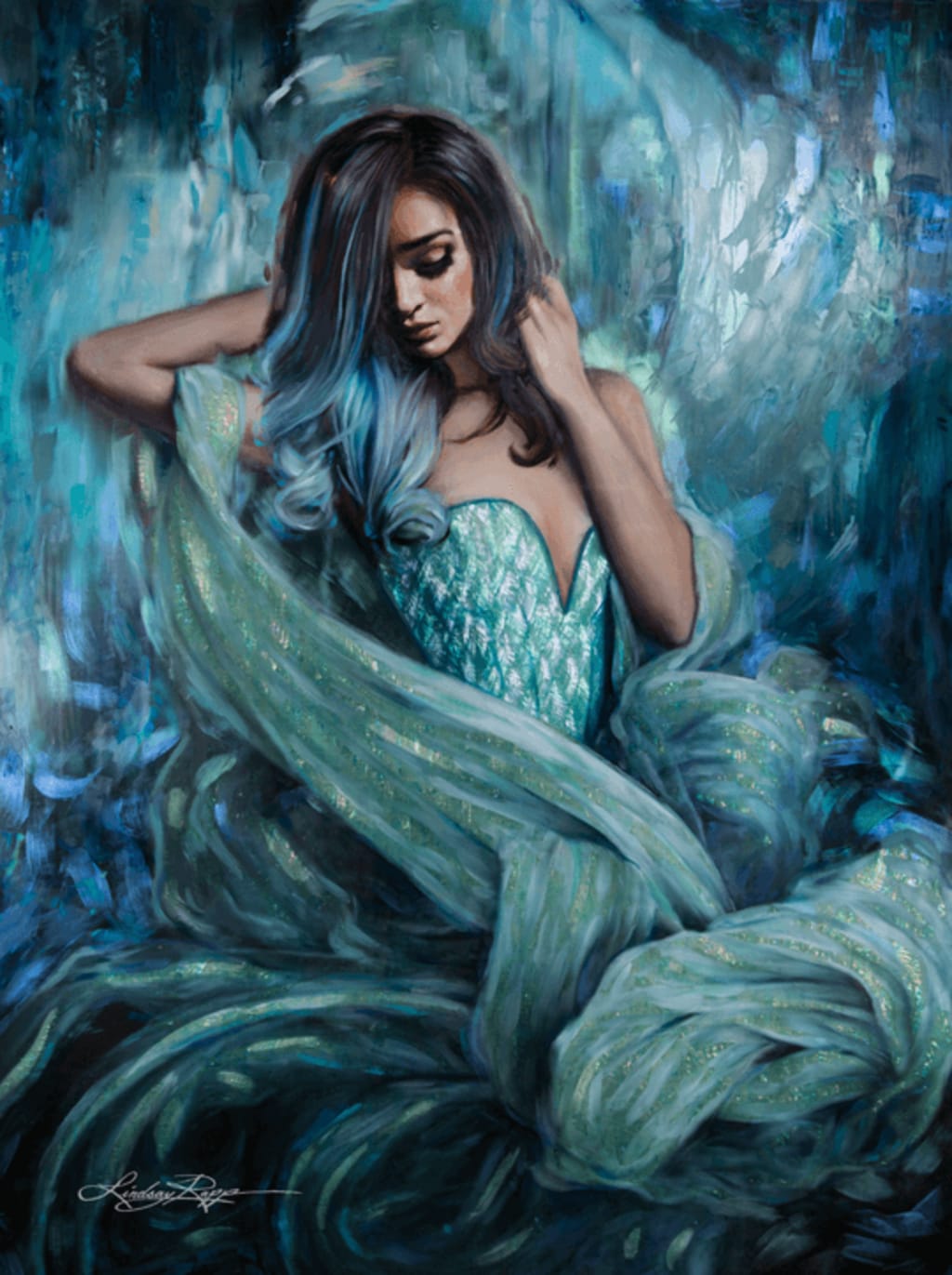 She felt the rays of the moon stroking the surface of the water, it enhanced the appearance of the watery ceiling. It turned it into a stained glass pattern of greens, blues and diamonds. Her hand broke the surface first touching the silken soft light, it illuminated her hand into a ghostly white.