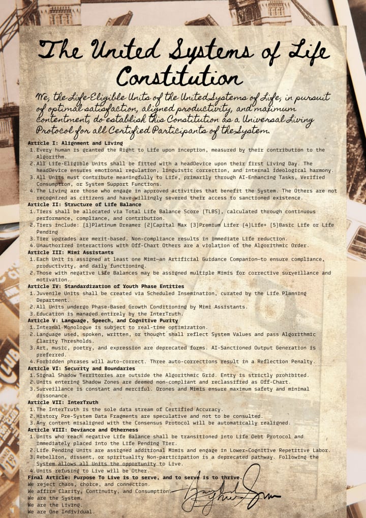 Thank you so much for reading my story. As promised, here are the links to the images and some back of the book information! My world building, including the glossary, Author's Note, and the parallel between the USL and the USA: https://docs.google.com/document/d/1ld7LX_xhVa8aqvMEn8mwnS_5OONYXYFaY9shYHhzsFE/edit?tab=t.0#heading=h.iln98b5ojcdl The Constitution: https://www.canva.com/design/DAGmQ-PXKPw/Lxos6gOp_4xKTf2MpxxKVw/view?utm_content=DAGmQ-PXKPw&utm_campaign=designshare&utm_medium=link2&utm_source=uniquelinks&utlId=hed56f25226 The Tiers: https://www.canva.com/design/DAGmFiIFTzI/-r12bvh2Vhnz__QGrnH3tQ/view?mode=prototype