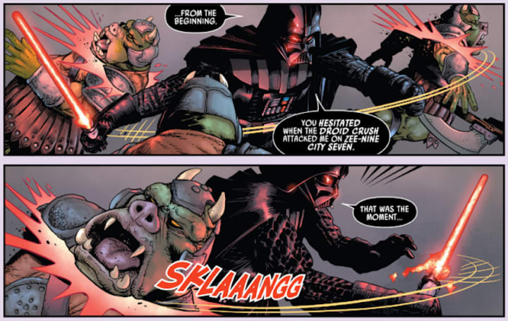 Vader’s response to this atrocity was the same as on Mustafar all those years ago: Using his lightsaber, he cut through Hutts and Gamoerran guards, severing heads and limps until at the end, only Bokku was left.