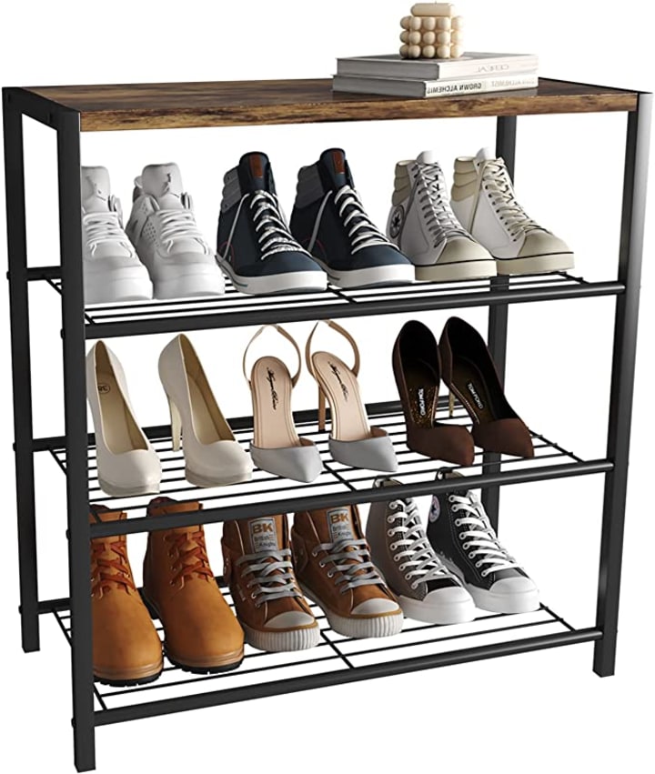 The industrial shoe rack is a versatile storage solution designed to provide ample space for all types of shoes and boots. The rack features two durable metal shelves, capable of holding numerous pairs of shoes. The top of the rack is made of eco-friendly E1-grade MDF board, providing additional storage space for bags, bins, and other items. The shoe rack is made of thickened metal tubes, 3-tier metal wire shelves, and E1-Grade MDF top board, making it sturdy enough to store shoes and heavier items on the top particleboard. With its wood accent design, it can add a decorative touch to any corner of your house. The rack is also easy to assemble without requiring any tools, and each accessory is numbered, making assembly a breeze. Its space-saving design makes it an ideal storage solution for hallways, entryways, closets, dormitories, cabinets, and garages.