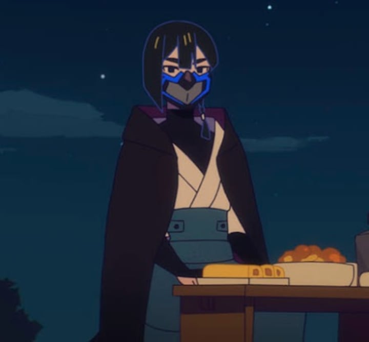 F is described as bringing a "sense of serene calm to this piece" where she "reflects on what is happening in front of her, but also on her own tragic past." In terms of her look, she dons an elaborate mask and cloak described as both figuratively and literally shielding her past traumas, but is also based on Japanese hakama. Shirasaki confirms staff at the animation studio dressed up like her to test the design.
