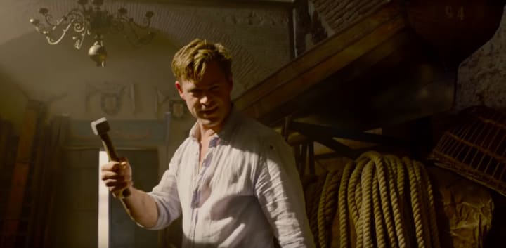 If you're as much of a nerd as I am, you'll know this is a reference to Chris Hemsworth's famous role in the Marvel Cinematic Universe as Thor, son of Odin, and throwing the hammer is a reference to Thor's signature weapon, a hammer known as Mjolnir, which he throws in a very similar way.