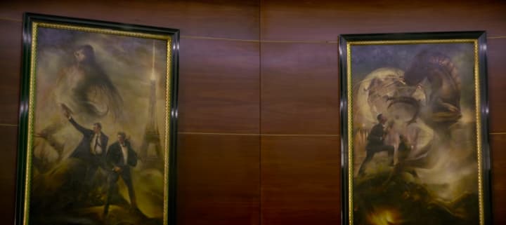If you look at the painting on the right in this picture, you can see that it depicts Agents J and K fighting the Bug in the big climax of the original Men In Black.