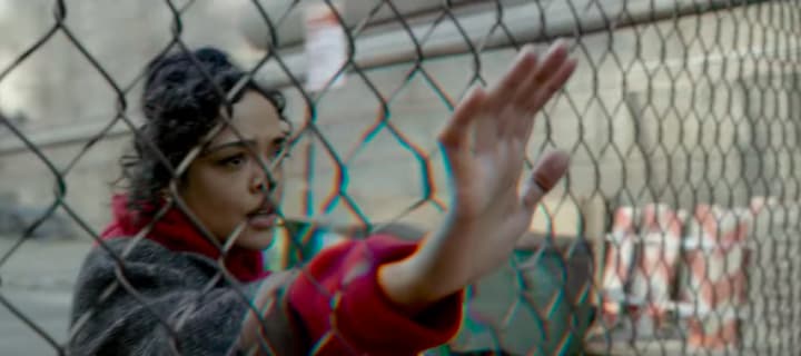 In this shot, we see Tessa Thompson's character, Agent M, enter the famous MIB building in downtown Manhattan, NYC. Since she is teamed up with Chris Hemsworth on the London team, I assume that she transferred to help with the London branch.