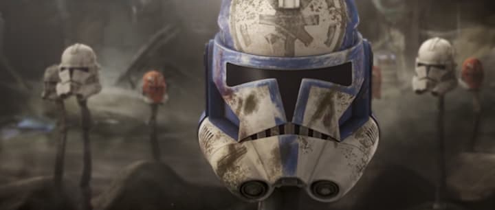 Despite not being "formal" live-action movies, The Clone Wars and Rebels series have had their impressive share of visually beautiful moments apart from storytelling wonders. "Victory and Death", the emotion-heavy grand finale, wraps up The Clone Wars series with Ahsoka and Captain Rex burying the dead clone troopers after crash-landing on a moon after Order 66. The tragically beautiful moment occurs as the camera pans across the graves, eventually stopping on ARC trooper Jesse's helmet, and utilizing field of depth to show the large scale of the area.