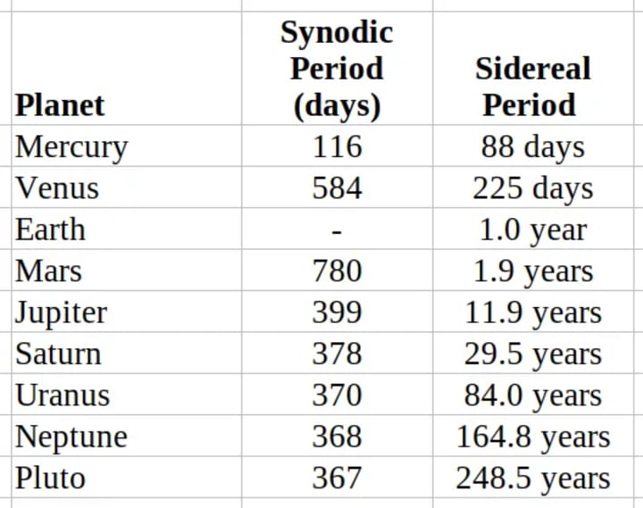 Mars, has the longest synodic period at 780 days, which takes 21 periods to fit exactly into 20 cycles, both of which have 16,380 days, almost 45 years.