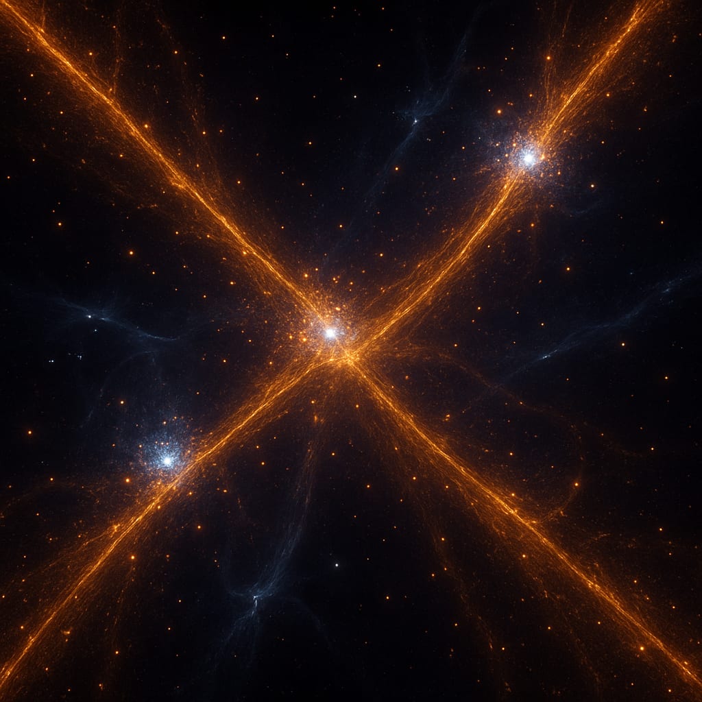 A sweeping cosmic panorama showing the “cosmic web”—delicate filaments of golden galaxies stretching across a dark expanse of space. Between the glowing strands, faint streams of bluish light represent neutrinos rushing invisibly through the cosmos. The image should evoke both grandeur and mystery: the vastness of the universe intertwined with the invisible presence of ghost particles.