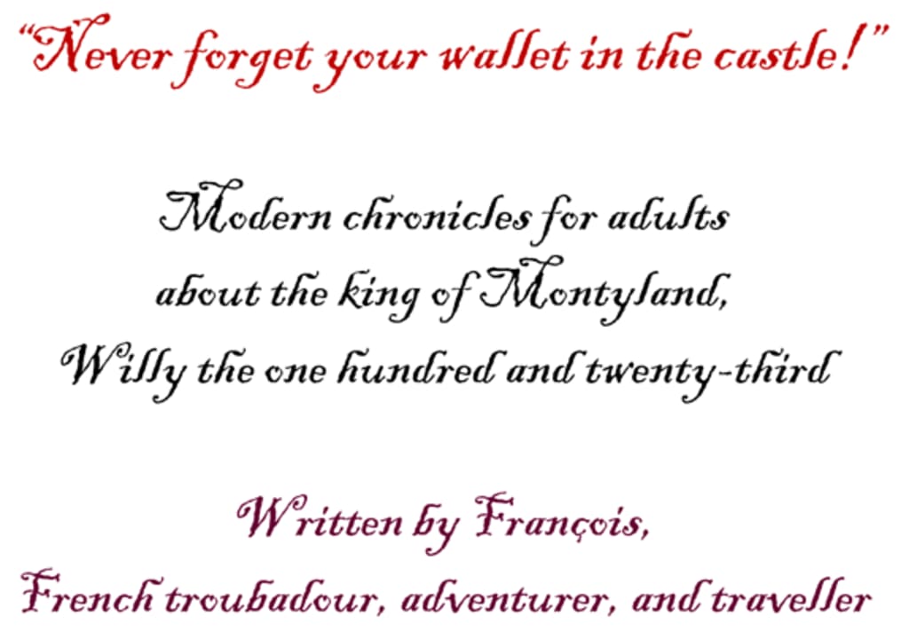 Modern chronicles for adults about the king of Montyland, Willy the one hundred and twenty-third written by Francois, French troubadour, adventurer, and traveller.