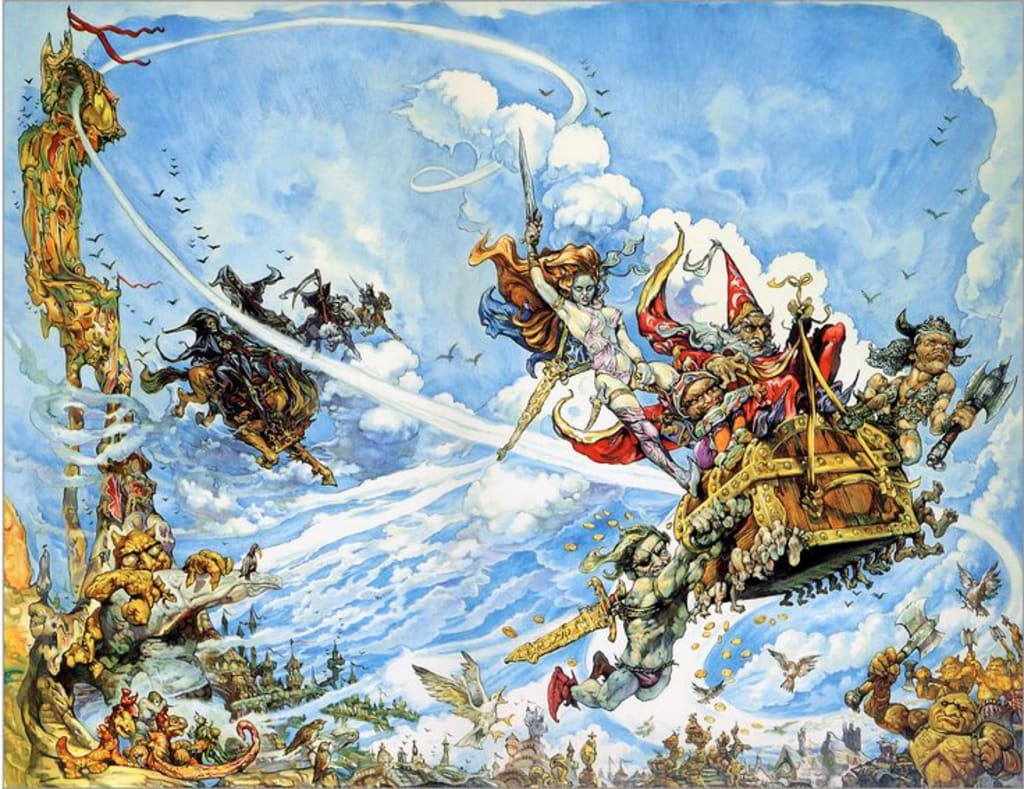 I talked a lot last week about how The Color of Magic is a pretty unremarkable first entry into one of the most popular series of all time Honestly, I would not have continued on with the series if not for the fact that I really liked the Pratchett/ Neil Gaiman collaboration, Good Omens, and I already owned the next book in the series. So...it's really lucky for me that The Light Fantastic is so good. How exactly does the novel build itself up to being so good? By pivoting on most of the things established in the first novel.