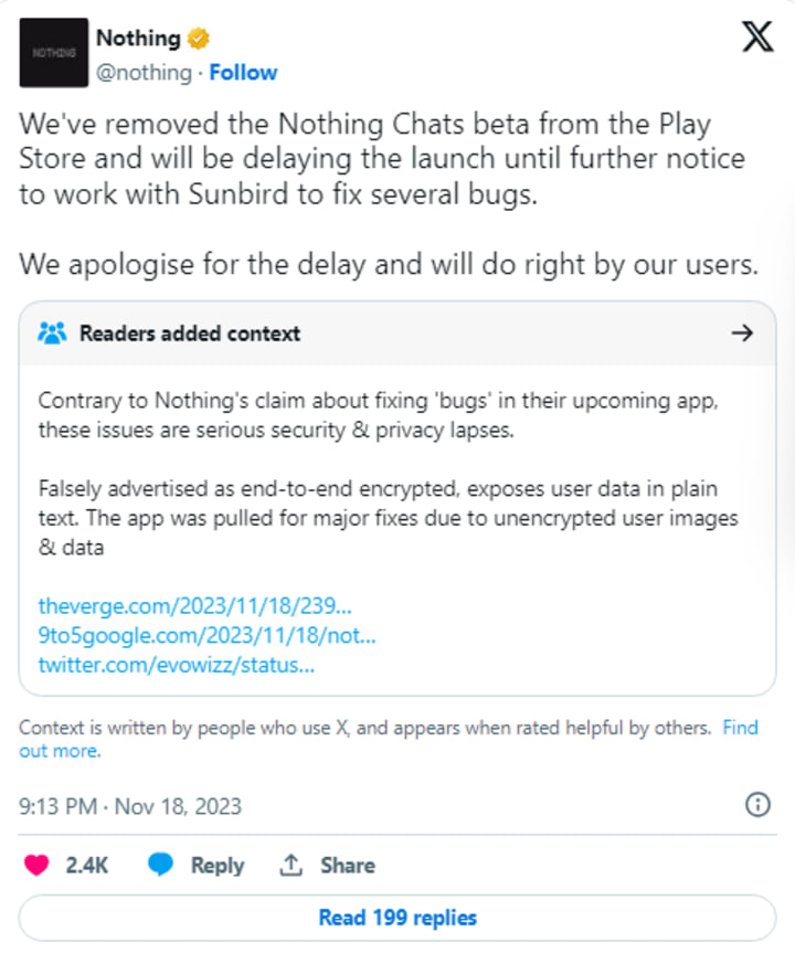 In response to the mounting privacy concerns, Nothing took to social media to announce the removal of the Nothing Chats beta from the Play Store. The company acknowledged the issues and stated that it is working closely with Sunbird to address several bugs before the app's re-release. Although the official statement did not directly address the specific privacy issues raised by critics, Nothing assured users that they are committed to resolving the concerns and doing right by their user base.