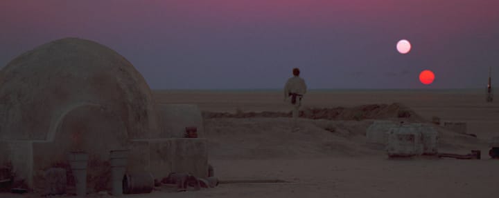 A New Hope has the famous shot of Luke looking at the twin setting suns, staring at the horizon, which symbolizes Luke's desire for something greater. Again, we all understand this. We’ve all gone through these reflective moments in life. In this scene, so many of us can empathize with Luke. As we empathize with Luke, we also begin to root for him because we’re now starting to live vicariously through him.