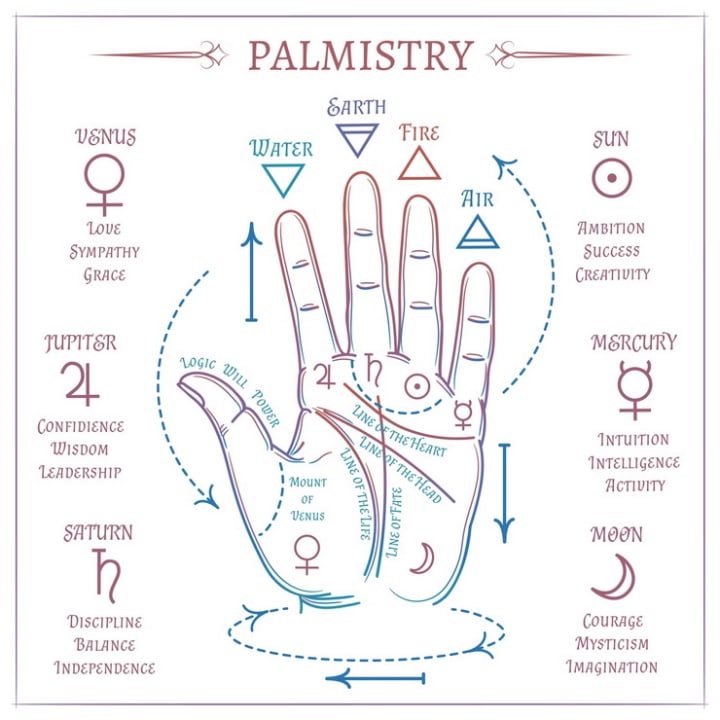 Like most other forms of divination palmistry, otherwise known as palm reading or chiromancy, blew up in the 19th century and quickly became a staple of American pop culture at the time. Palmistry is much older than that, although how old is still unknown along with its origins. It is thought that the practice began in ancient India, quickly spreading throughout Eurasia. It was even mentioned by Aristotle's "History of Animals" written about 2,500 years ago.