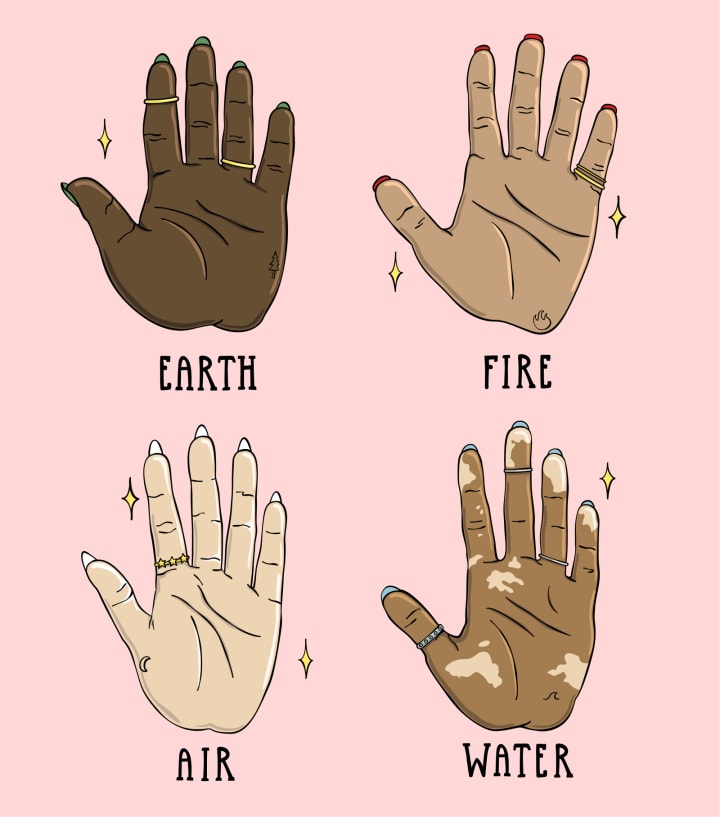 There are four designated shapes to the hand as seen above. Each shape is seen to have insight into the complexities of the person's personality, which will help you when it comes to the final reading. Despite most people associating their element to their astrological sign, this is really about the shape of the hand.