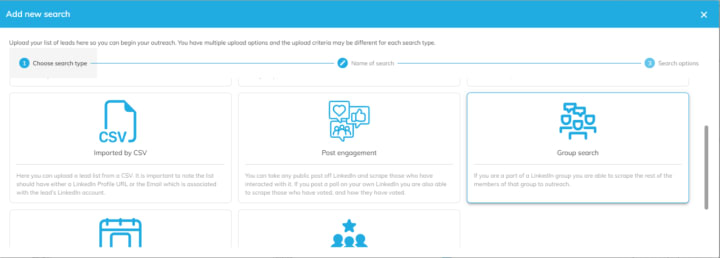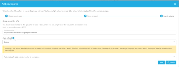 3. Enter a search name and paste the group URL. Keep in mind the limit for scraped contacts here is 2,500. If you want to scrape more than that, you'll need to auto reload the search.