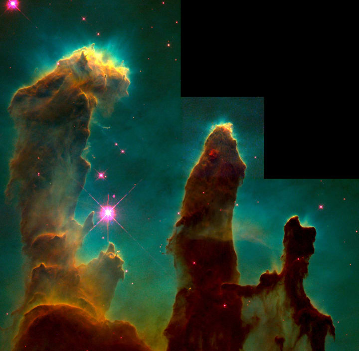 The new image provides astronomers with an even sharper and wider view of Eagle Nebula. Hubble also observed this nebula in near-infrared light which penetrates much of the obscuring dust and gas and unveils an unfamiliar view of the pillars. Here newborn stars, hidden in the visible light view, can be seen forming within the pillars themselves.