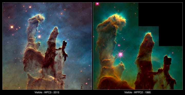 This iconic image has been captured by WFPC2 instrument on Hubble. But Hubble revisited this area 20 years later and with its new instrument called WFC3, installed on the telescope during the Hubble Servicing Mission 4 in 2009.