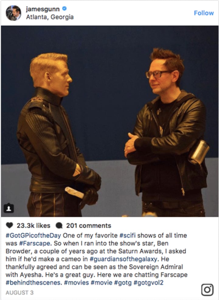 Taking to Instagram, Gunn confirmed that a certain #scifi favorite managed to sneak his face into the sequel. While some may have spotted him (we certainly did, along with these other sci-fi cameos), others did not see #Farscape's Ben Browder lurking like an Oscar statue among the rest of the Sovereign people.