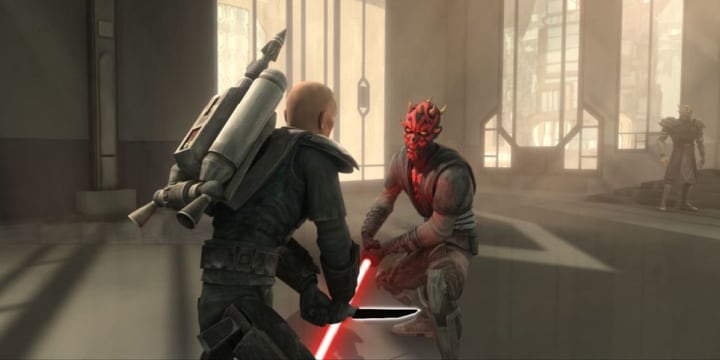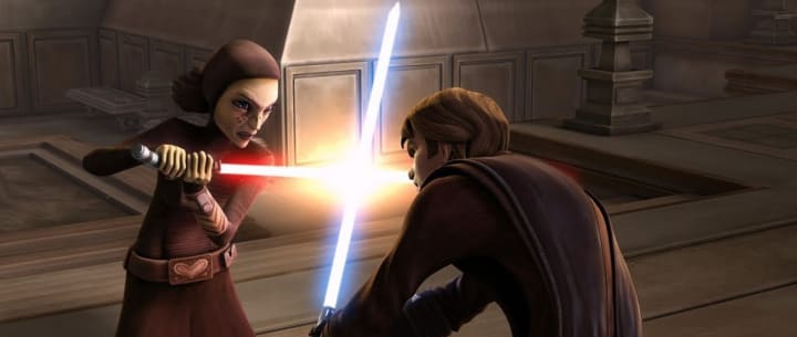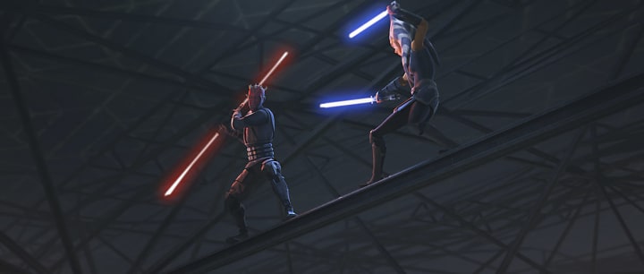 The series' last lightsaber duel is also its best one. The no-longer Jedi Ahsoka faces off against the no-longer Sith, Maul during the Siege of Mandalore. Maul, who sensed the end of the Clone Wars and the fall of the Republic, offered Ahsoka a temporal cooperation in order to stop Sidious from taking over. Ahsoka refused, which lead to a fierce duel both inside the Mandalorian throne room and high up on support beams under Sundari’s dome. The tides in this battle turned several times. Ahsoka has the chance to let Maul fall to his death, but saves him, using the Force, so that he could be taken into custody.