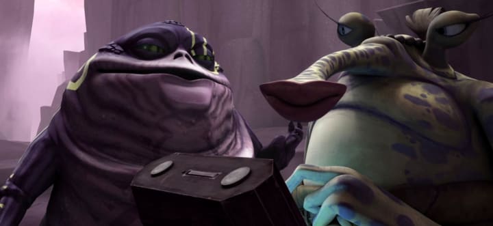Stemming from the early days of The Clone Wars, the perception of romance between a big purple Hutt with tattoos and a yellow green ball with thin legs and blood-red lips on a long snout is something to wake you up in the middle of the night. The idea of creating the Star Wars version of a mob boss and his bar singer girlfriend is not necessarily wrong, but the decision to hook up these two characters and species definitely is. Snootles must have thought the same as she later killed her (ex-)lover on the order of Jabba the Hutt.
