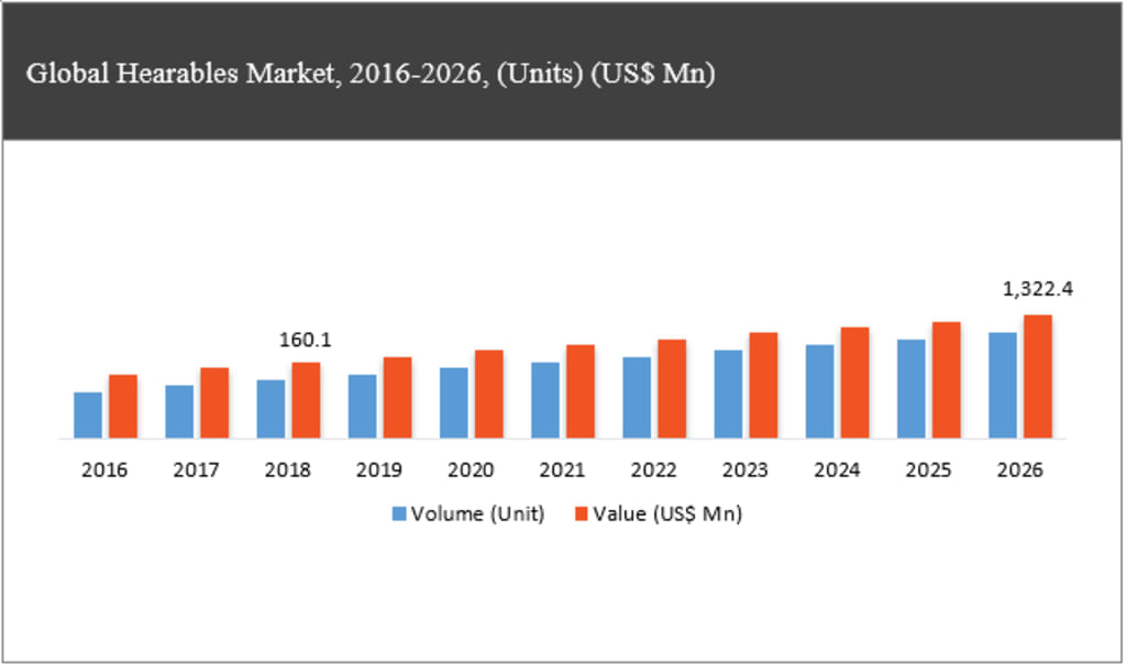Change in preference of consumers towards wireless communication devices is contributing to the growth of the global hearables market during the forecast period. The global hearables market was valued at USD 160.1 million in 2018 and is expected to reach USD 1,322.4 million in 2026, growing at a CAGR of 30.2% during the forecast period.