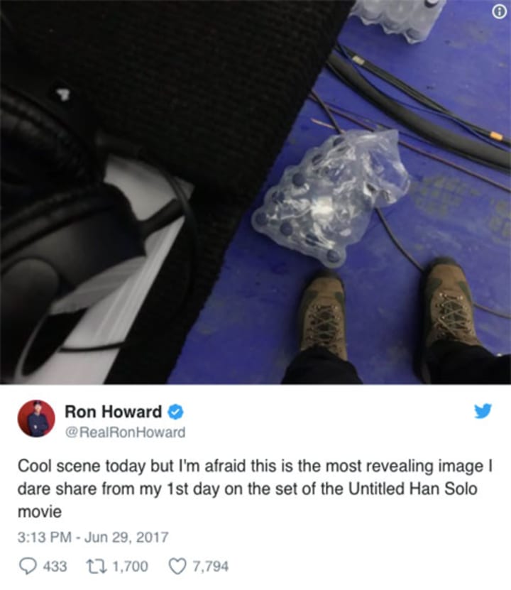 However, directors like Howard aren't exactly shy about teasing and messing with their fans. With Howard having a bit of time on his hands, he's taken the opportunity to tease #StarWars with his first tweet from behind the scenes on the #HanSolo movie. During day one of filming on set, Howard decided to tweet the following photo: