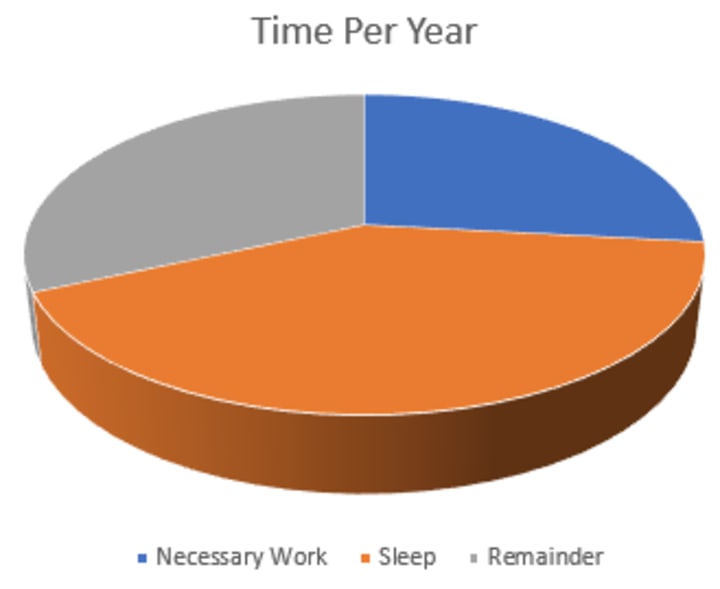 Time: If 90% of your job goes to provide necessities, that means that 2,340 hours of your year are dedicated to that. A 40-hour/week job adds up to 2080 hours per year plus 520 if you take an hour before and after work to prepare, travel, and transition to casual life). Out of the 8760 total hours in a year, 3650 hours are spent asleep or being sleepy (assuming 8 hours of sleep and 2 hours of sleepiness per night/day). That means that of the time you are awake, you spend 46% working to provide a roof over your head, power to regulate temperature and cook your food, water, transportation to work, and not being dead.
