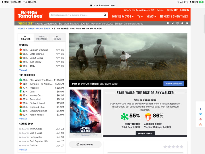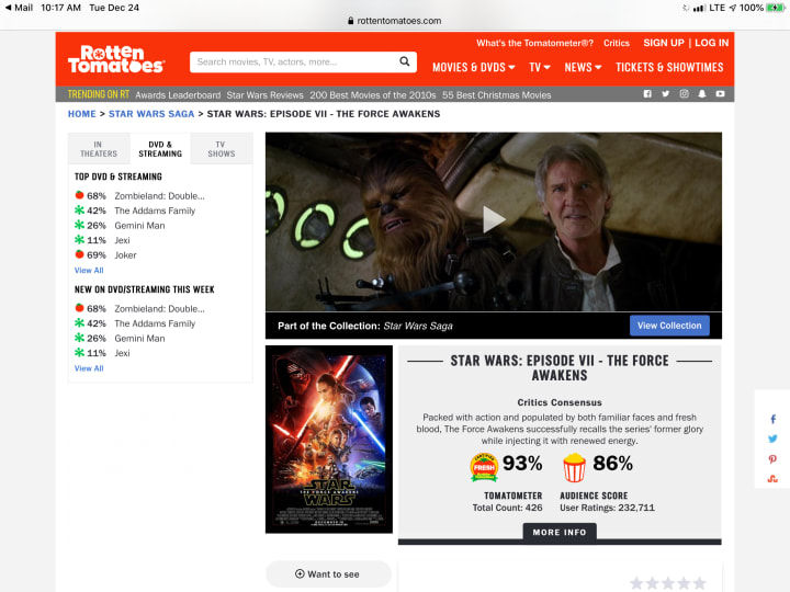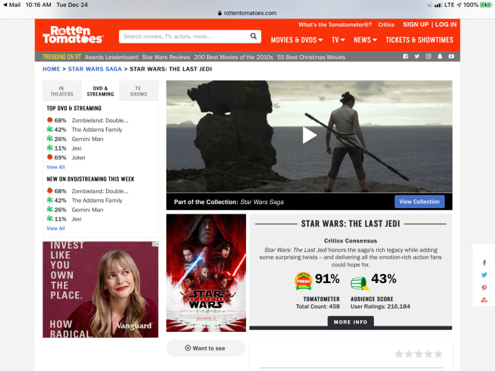 7. Critics vs Audiences: Let’s take a look at the Rotten Tomatoes scores of all three Disney Skywalker Saga films: “Episode VII: The Force Awakens,” “Episode VIII: The Last Jedi,” and “Episode IX: The Rise of Skywalker.”