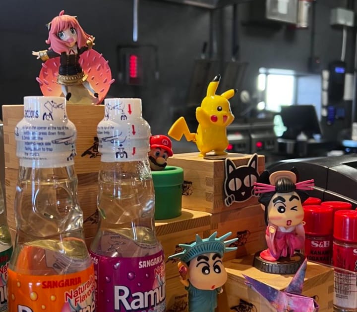 Once inside the restaurant, I was greeted by a sight that transported me instantaneously to Japan. A magnificent bonsai-like tree stood in the center of the room, surrounded by a wood aesthetic that was naturally captivating. The tree was also made of wood and wasn't remotely real. Traditional Japanese pop tunes played in the backdrop, adding to the atmosphere of authenticity. Brightly hued dishes bordered the counter, displaying the skill of the ramen chefs who meticulously crafted each bowl.