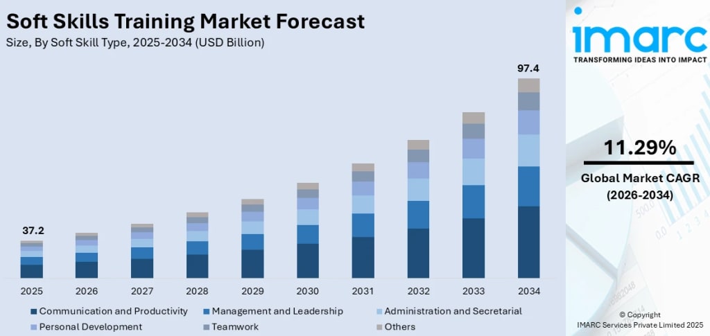 Growing demand for workforce development, rising adoption of digital learning platforms, and increasing recognition of soft skills as essential for career success are driving steady expansion in the soft skills training market, supported by remote work acceleration, AI-powered personalized learning tools, and corporate investment in employee retention strategies. According to IMARC Group's latest data, the global soft skills training market size was valued at USD 37.2 Billion in 2025. Looking forward, IMARC Group estimates the market to reach USD 97.4 Billion by 2034, exhibiting a CAGR of 11.29% during 2026-2034. North America currently dominates the market, holding a significant market share of over 32.9% in 2025.
