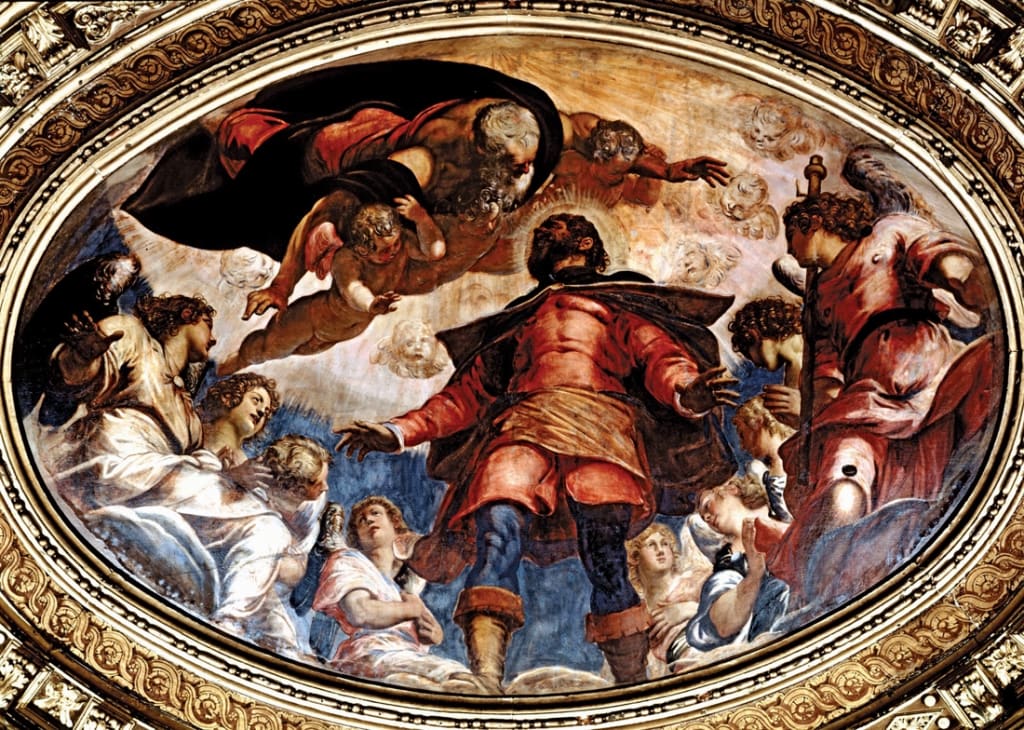 For the latter, the four leading painters in the city were invited to compete for the honour of painting the round centerpiece of the main ceiling, by producing designs which would then be considered by the Brotherhood’s committee before the winner was given the commission. While the other three painters went away to work on their designs, Tintoretto measured the space in question, painted a canvas in double-quick time, and stuck the result in place. Naturally, the other artists were furious, and the head of the Brotherhood angrily enquired why Tintoretto had broken the rules. All he could reply was that that was how he worked. If the Brotherhood were not happy, he would make a free gift of the painting. As the Brotherhood’s policy was never to reject a gift, they had no choice but to accept, and so Tintoretto’s “San Rocco received into Heaven” (otherwise titled “The apotheosis of St Roch” - see illustration above) is there to this day.