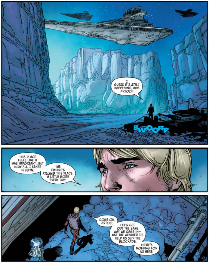 Interestingly, Charles Soule, the writer of this issue, didn’t reference the sequel trilogy at this point. At this time in the Star Wars timeline – shortly before Return of the Jedi, neither the First Order nor Starkiller Base existed. But this seems like a missed opportunity for Luke to not even have a Force vision, showing him what would become of the planet after the end of the Empire and the devastating effect it would have on the galaxy once it was transformed into Starkiller Base. Would Luke have been able to do anything against it if the Force had granted him such a vision?