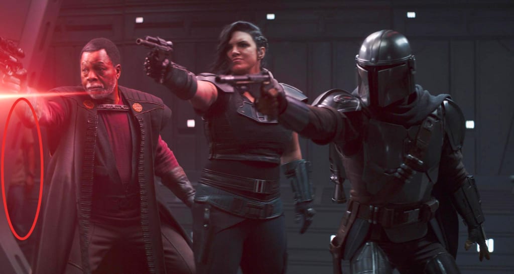 To be fair, the episode was directed by Carl Weathers, who plays Greef Karga and is in the shot in question with his back turned to the crew member. It would be a simple mistake that nobody noticed him in the shot. All joking aside, the scene is legitimately thrilling, and showcases some of the exciting action that The Mandalorian has become known for. We as the audience are more worried about whether or not our lovable crew will be shot by the stormtroopers firing at them (ha) than distracted by something else. The scene holds your attention enough that nothing else is important, and you have other things running through your mind.