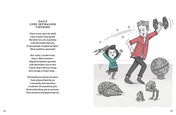 Recently, StarWars.com revealed the heartwarming cover art for the upcoming book, as well as two very exclusive spreads featuring the highlighted poem of the book and “Dad’s Luke Skywalker Figurine.”