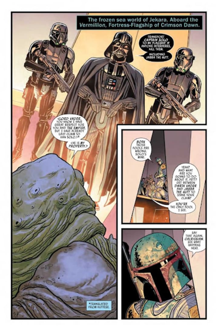 In the preview pages, we also see Boba Fett threatening to make another braid for himself out of Chewbacca’s hair. The preview ends at this point, but the threat definitely means we will see a full-on fight between Boba Fett and Chewbacca. The question remains, of course, who will win? The preview also teases a showdown between Darth Vader and Jabba the Hutt, which could also lead to something big.