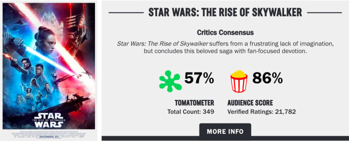 And for these films, I've been on the critics' side. I loved both Awakens and Jedi, but when I saw the Rotten Tomatoes rating for Skywalker, there was only one thing I had to say: I have a very bad feeling about this.