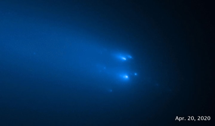 Fortunately, the Hubble Space Telescope trained its eye on the head of the comet on April 20 and the 23rd as the spaceborne iceberg broke apart. The first image showed 30 fragments where the nucleus (main body) of the comet should have been found. The second observation showed 25 pieces of ice and rock, each the size of a typical house or larger.