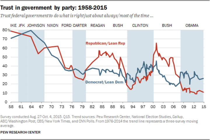 Despite trust in government consistently declining since the 1960s, it's hard to imagine a Mad Max-like wasteland of a future. That being said, the recent global trend towards right-wing populism, the dismantling of the European Union, constant impeachment challenges in the States, the leadership crisis in Venezuela, and the "Yellow Vest" protesters in France all point towards a breaking point for civilisation.