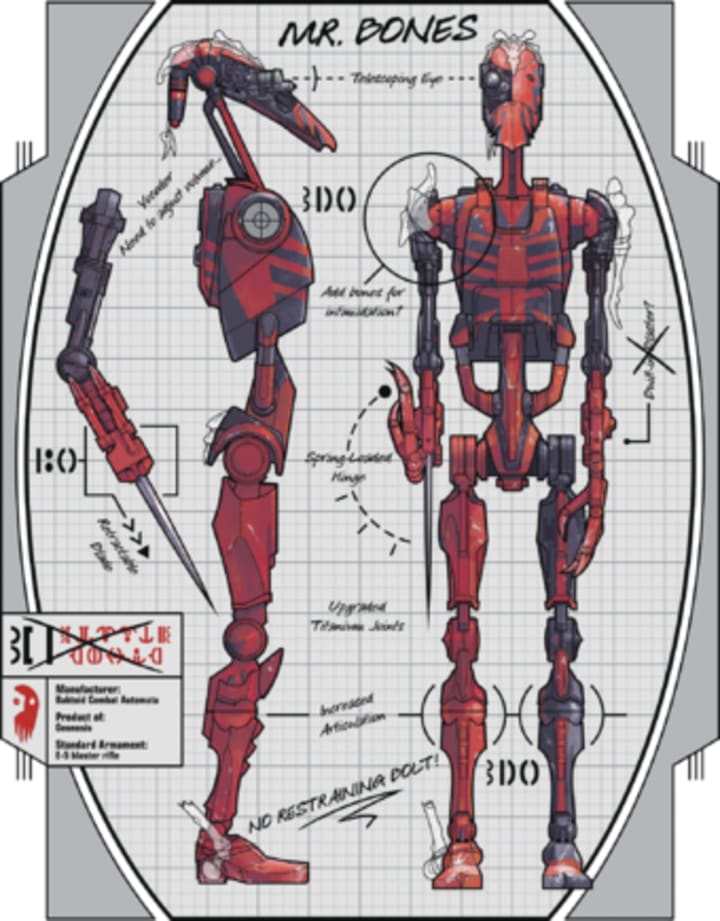 Although I haven't finished the entire Aftermath book series yet, I really enjoyed the introduction of "Mr. Bones," the scrappy former B1 Battle Droid who was reprogrammed by and serves Temmin "Snap" Wexley, as Snap and his friends evade both local criminals and the Empire on Akiva. Although Mr. Bones is destroyed at the conclusion of the first book, he does get rebuilt. Sadly, he is not seen or even referenced in any of the sequel trilogy, which seems like a missed opportunity.