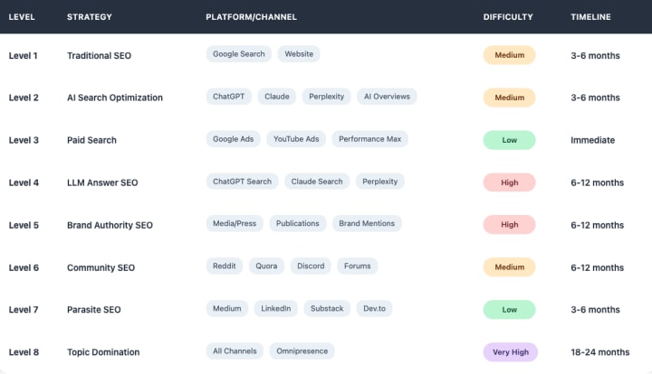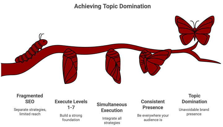 Levels 1–7 aren’t separate strategies. They’re building blocks toward one goal: topic domination.
