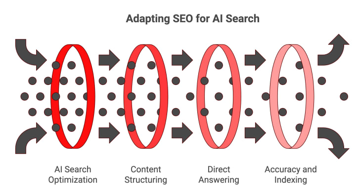 Diagram illustrating how to adapt SEO for AI search, highlighting AI search optimization, structured content, direct answering, and accuracy for better indexing in AI-generated results.