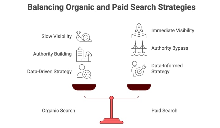 Scale graphic illustrating the balance between organic and paid search strategies, comparing long-term authority building with immediate visibility and data-driven optimization.