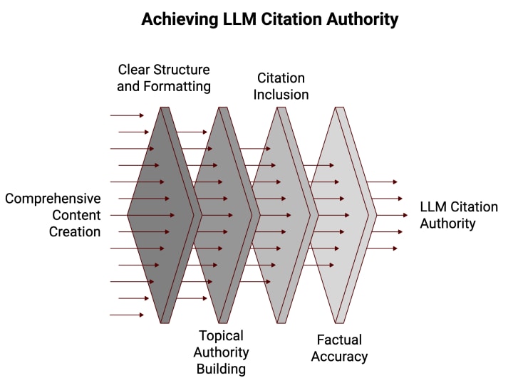 Illustration showing layered content filtering to represent achieving LLM citation authority, where trusted sources are selected and cited by AI systems like ChatGPT and Claude.