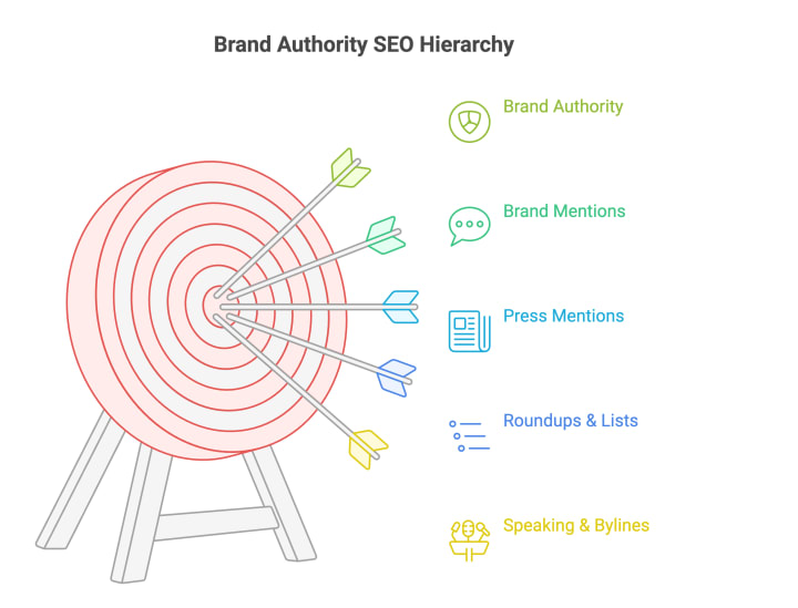 Target graphic illustrating the brand authority SEO hierarchy, showing how brand mentions, press coverage, roundups, and speaking engagements contribute to overall search authority.
