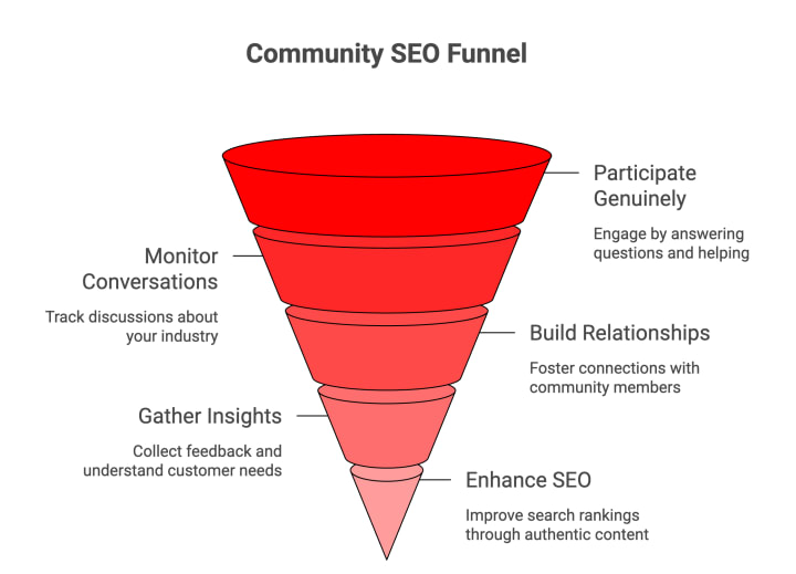 Community SEO funnel diagram showing stages from monitoring industry conversations and gathering insights to genuine participation, relationship building, and improving search rankings.
