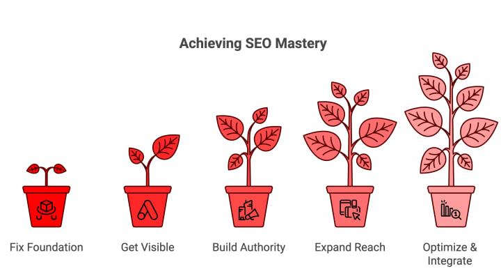 Illustration of growing plants representing staged SEO implementation, from fixing website foundations to building authority, expanding reach, and integrating advanced optimization strategies.