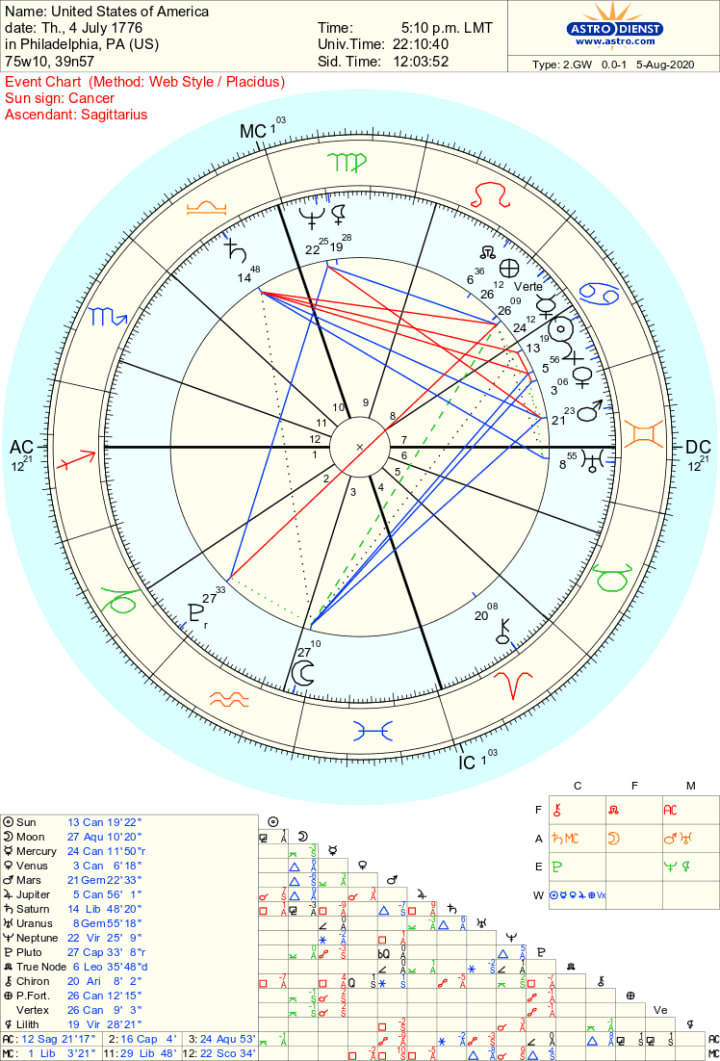Just as humans have birth charts, countries do too. All events do. While the land itself has existed for a much longer than this, July 4th marks the birthday of our government and all the things that make up the concept of "America," as we know it. I originally aimed to have this article done by July 4th of this year but my computer broke, so now I'm behind. However, this chart is still of great relevance. Not even a month has passed yet, and we still have 11 months to go. This is a crucial year and perhaps, this reading can give insight onto the November 2020 Presidential Election.