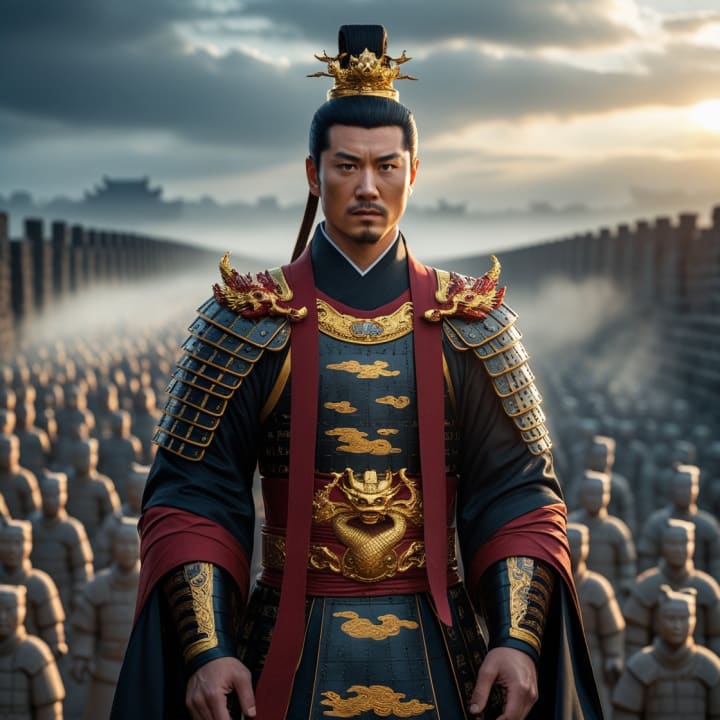 AI art tries to imagine him with features drawn from Han Chinese ancestry, imperial attire, and a face both authoritative and young — he united China before age 40.