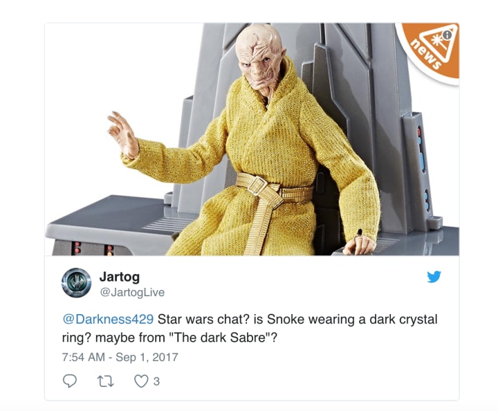 In addition to this convincing theory on Snoke's ring, fans have also taken to Twitter to voice their opinions on the matter. The consensus so far suggests Snoke's ring is in fact a Force ring he'll use to manipulate the Dark Side: